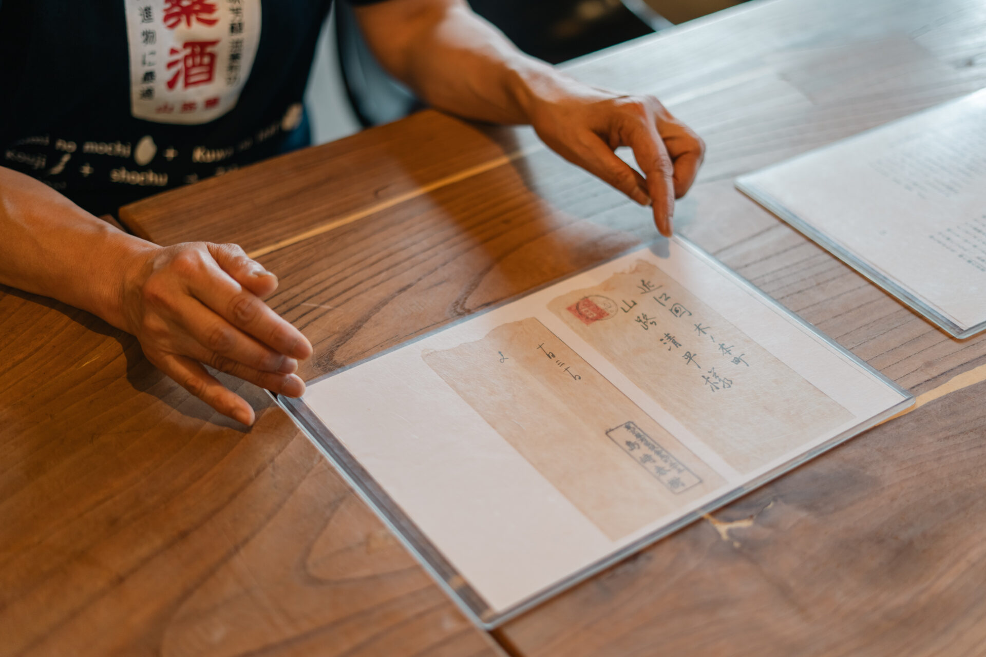 こちらは大正時代、桑酒の取り寄せを依頼するお手紙。宛名の『清平(せえべえ)』は山路酒造の屋号で、代々襲名してきた名前なのだそう。