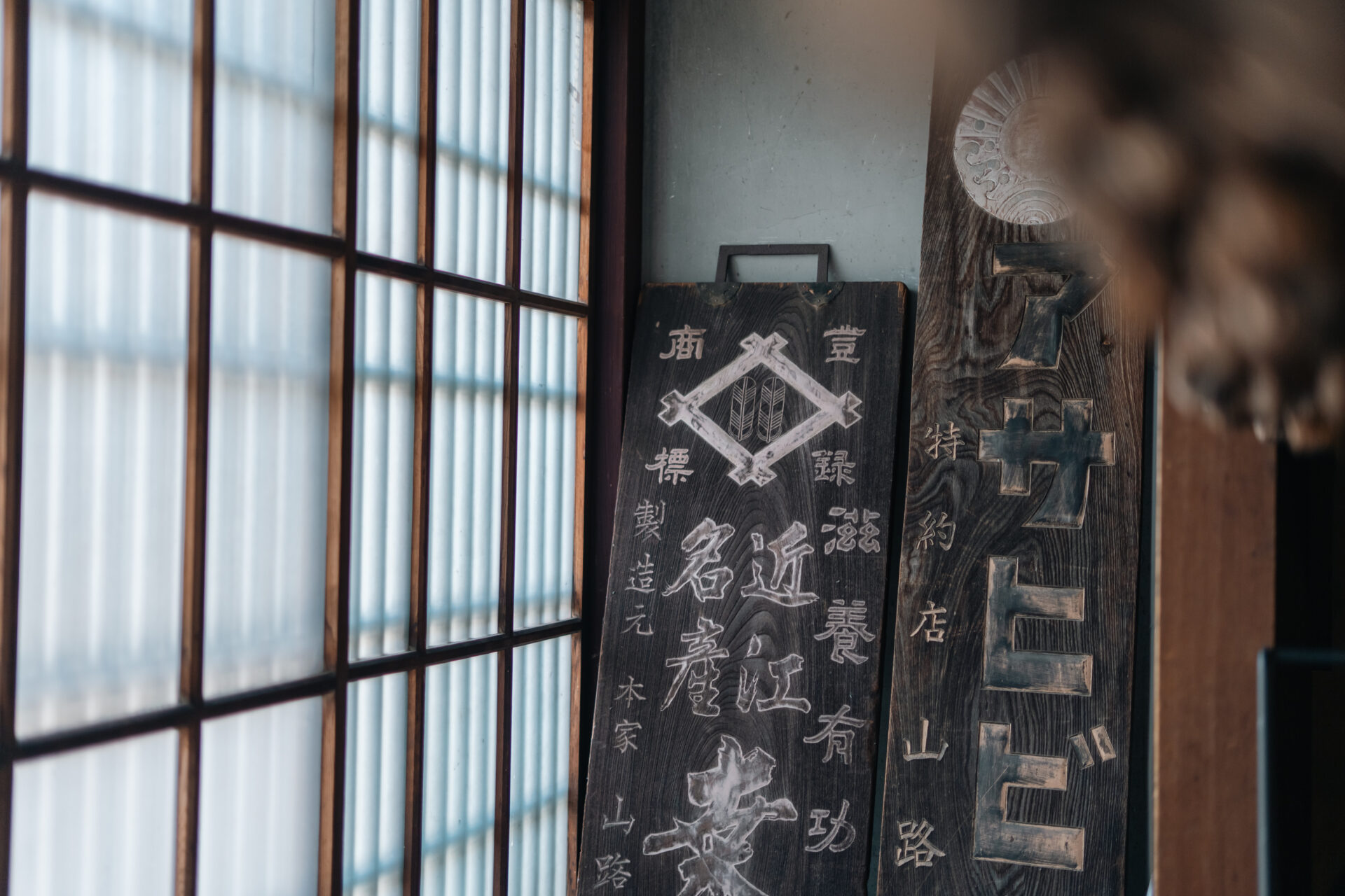 町並みのあちこちに、宿場町だった当時を想起させるような風情ある建物が残る木之本。山路酒造の主屋も例外ではなく、江戸時代から300年ほど建つ門の部分は、登録有形文化財に指定されています。釘を使わない、お寺や神社と同じ建て方なのだそうです。