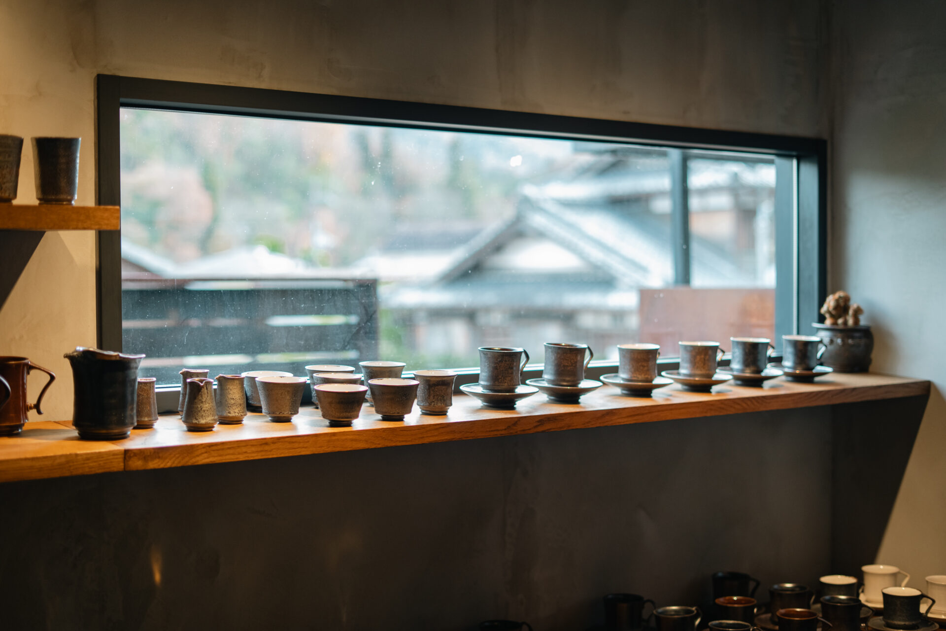 陶芸の森やMIHOミュージアムへ向かう途中、山あいの道の脇にふと現れるこの店は、2002年のオープン以来、20年以上にわたって信楽の日常と、訪れる人の時間をつないできました。ショーケースの前で迷う時間、コーヒーとケーキの相性、器や空間との調和。そのすべてを「組み合わせ」として捉えて、丁寧に積み重ねてきた場所です。