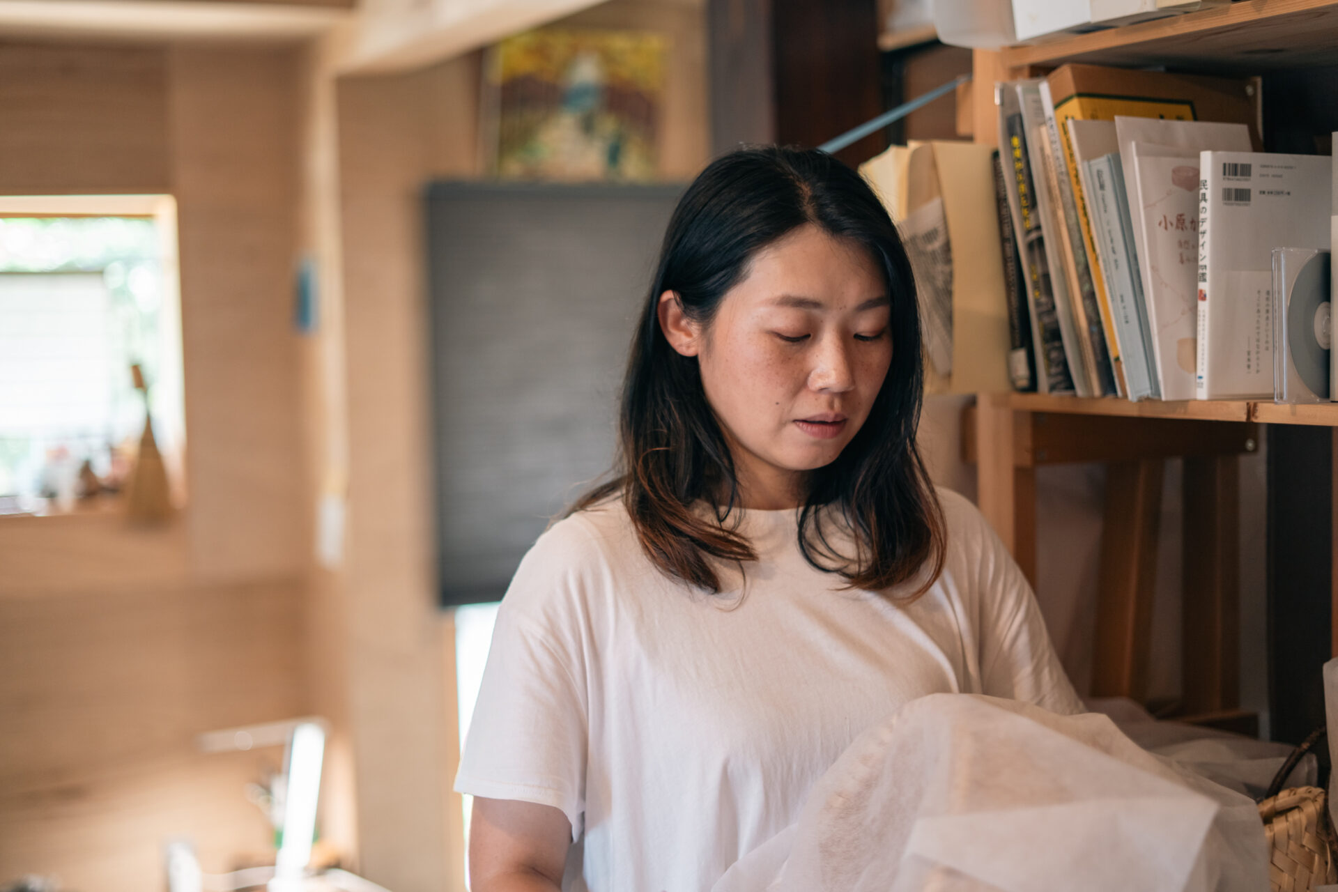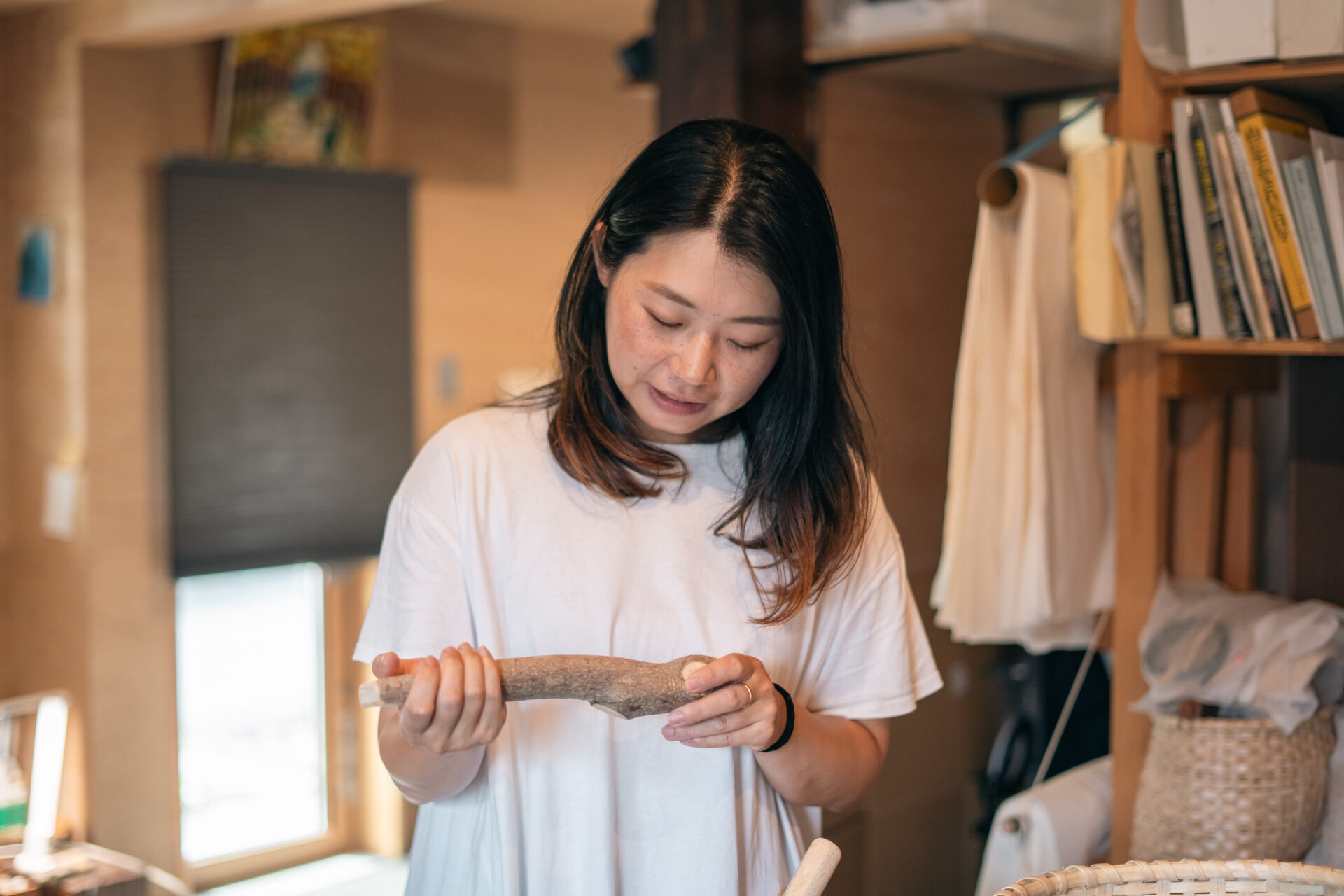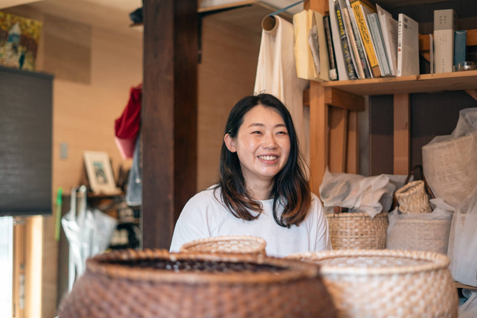 「東京の美術大学出身で、卒業後は長らく北陸で働いていました。働きながら大学院に通っていて、そこで民俗技術っていう、生活に根ざした物作りの技術の研究をしていました。夫が長浜出身なので、長浜で住むのが決まるか決まらないかぐらいの時に、長浜地域の民俗技術はないかなって思ったんです。調べていく中で小原かごのことを知りました。実際引っ越す前に太々野さんという方に会いに行って、引っ越してきてからすぐにカゴ作りの教室に通い始めて今にいたります。」